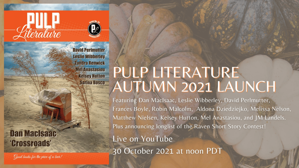 Join us this Saturday at noon PDT for the launch of Pulp Literature Issue 32! With readings from Dan MacIsaac, Leslie Wibberley, DK Perlmutter, Frances Boyle, Robin Malcolm, Aldona Dziedziejko, Matthew Nuclear Jackal Nielsen, Kelsey Hutton, and JM Landels.